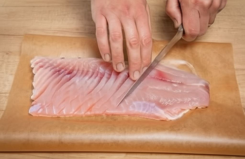 Rybę oczyść ze skóry, usuń z nich grube ości formując dwa duże filety. Każdy filet ponacinaj ostrym nożem od strony mięsa, uważając by nie uszkodzić skóry. Mięso nacinaj ukośnie, a potem odwróć filet w przeciwną stronę i zabieg powtórz. Mięso powinno być bardzo drobno nacięte na ukos jeden przy drugim. Dzięki temu maleńkie ości znajdujące się w mięsie nie będą tak odczuwalne. Filety podziel na mniejsze kawałki, zalej mlekiem z cebulą, odstaw do lodówki na minimum 6 h. Pozbędziemy się w ten sposób mulistego zapachu, który posiadają ryby żerujące przy samym dnie.