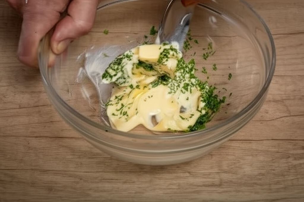 W międzyczasie masło połącz z sokiem cytrynowym, czosnkiem, natką i koperkiem, lekko je posól. Masło wyłóż na folię spożywczą, a potem uformuj z niego wałek zwijając folię. Masło włóż do lodówki.