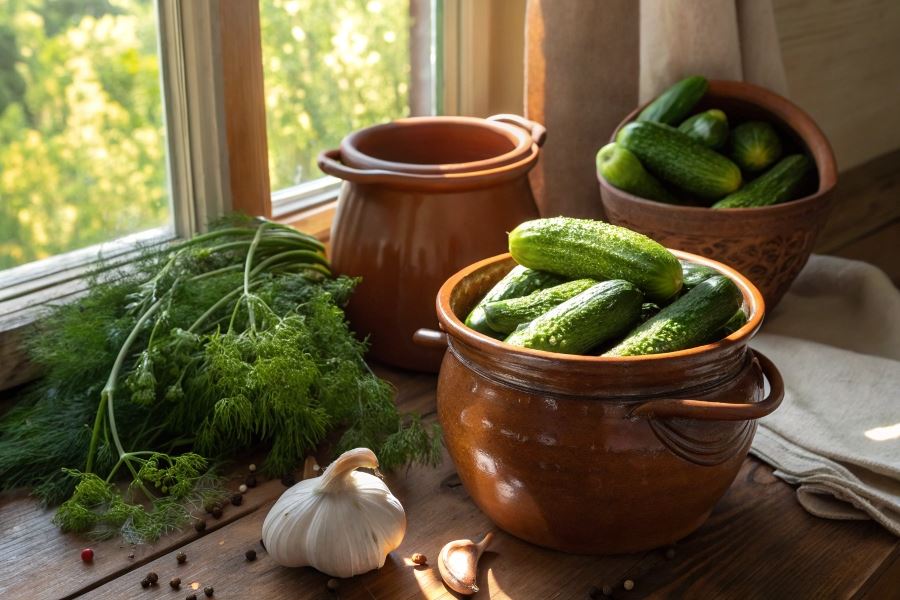 Zalej całość przygotowaną zalewą solną. Przykryj naczynie talerzem i obciąż kamieniem, aby ogórki były całkowicie zanurzone. Odstaw w ciepłe miejsce (20-22°C) na 3-4 dni, a następnie przenieś do chłodniejszego pomieszczenia (12-15°C).
