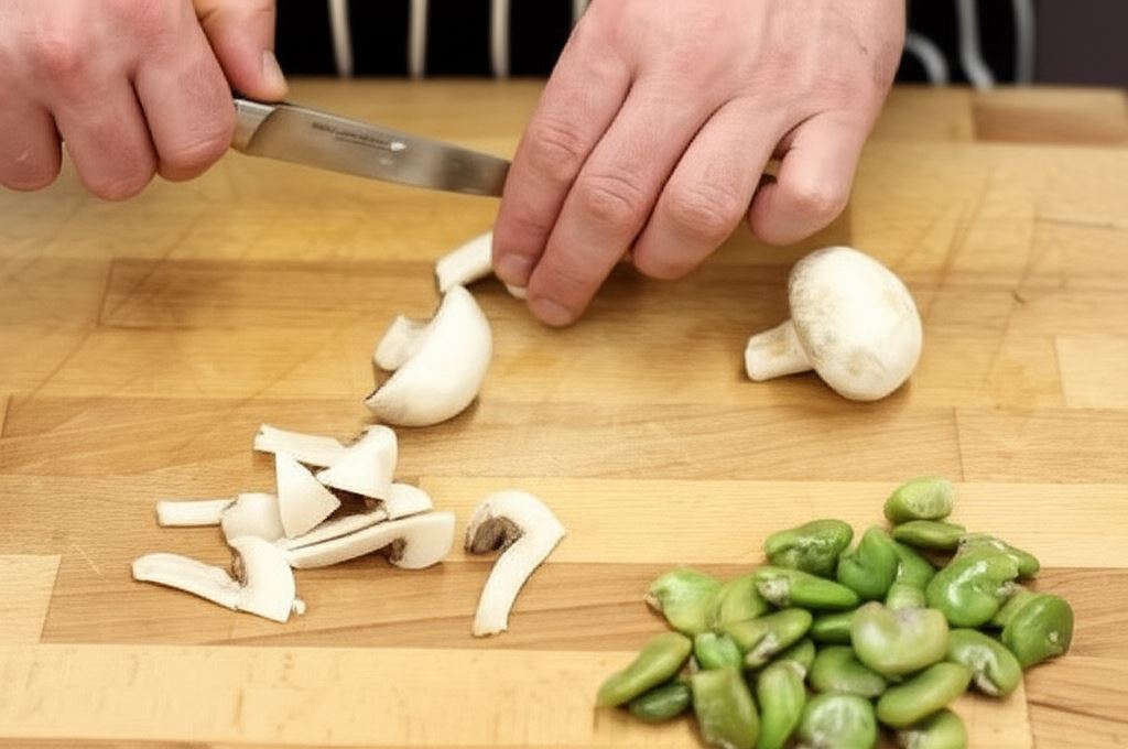 Bób ugotuj w delikatnie posolonej wodzie, ostudź i obierz ze skórek. Pieczarki pokrój na ósemki.
