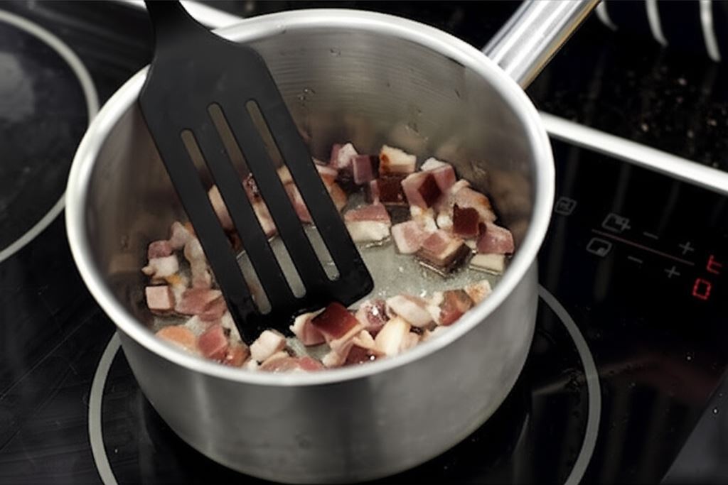 Boczek pokrój w małą kostkę i obsmaż w rondlu na gorącym oleju. Dorzuć pieczarki i smaż moment razem.