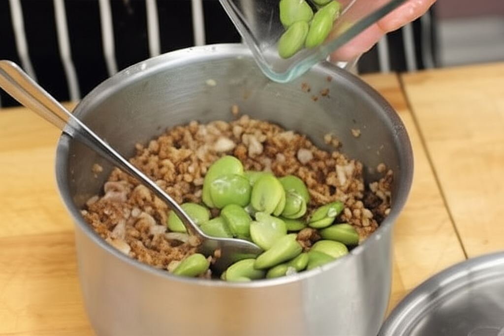 Kilka minut przed zakończeniem dodaj do garnka przygotowany bób, zamieszaj i ponownie nakryj garnek pokrywką.