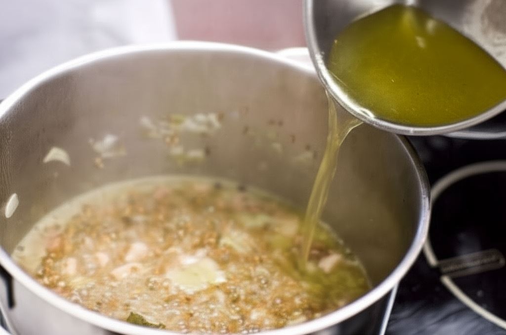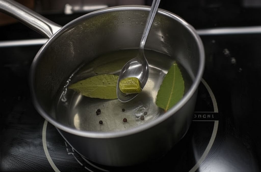 Doprowadź do wrzenia pół litra wody, wsyp kostkę Knorr, ziele angielskie, liść laurowy i pieprz, całość gotuj przez dwie minuty.