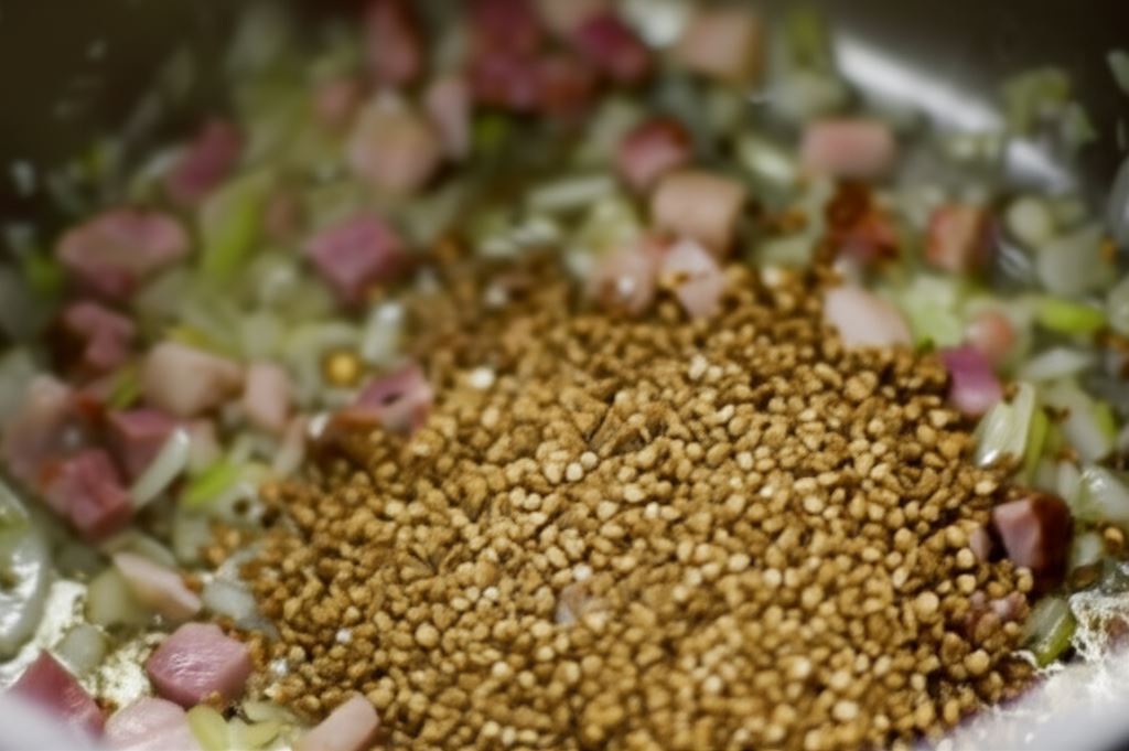 W płaskim rondlu (wybierz taki, który zmieści się z pokrywką w piekarniku) zrumień boczek, wsyp cebulę i czosnek. Smaż całość około 3 minut, wsyp kaszę, przesmaż ją moment, mieszając z resztą składników.