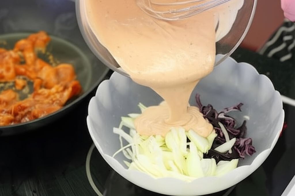 Na rozgrzanej patelni podsmaż zamarynowane mięso z kurczaka. Pomidory opłucz, usuń szypułki i pokrój w półksiężyce. Cebulę obierz i posiekaj w piórka. W dużym naczyniu spożywczym połącz obydwa rodzaje poszatkowanej kapusty i pokrojoną cebulę, po czym dodaj wcześniej przygotowany sos i wymieszaj ręką starannie wszystkie składniki domowego kababu.