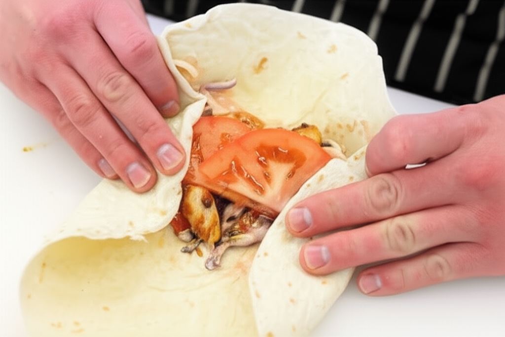 Na stolnicy, blacie kuchennym lub stole rozłóż tortille – na każdą nałóż kapustę wymieszaną z sosem, usmażonego kurczaka i pomidora pokrojonego w półksiężyce. Całość zwiń dość mocno, zawijając boki tortilli do środka, by farsz domowego kebabu z kurczakiem nie wypadał na zewnątrz.