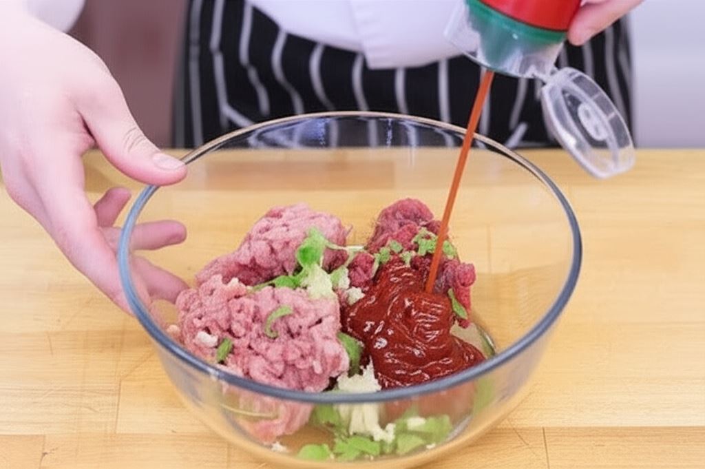 Mięso mielone przypraw wyciśniętym czosnkiem świeżym, suszoną kolendrą i ketchupem.