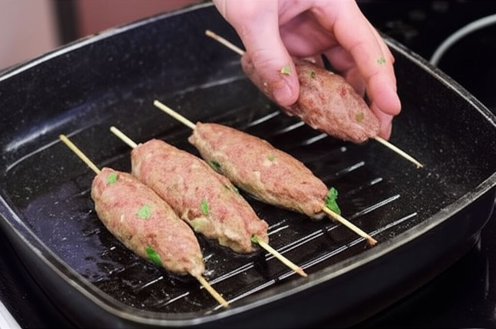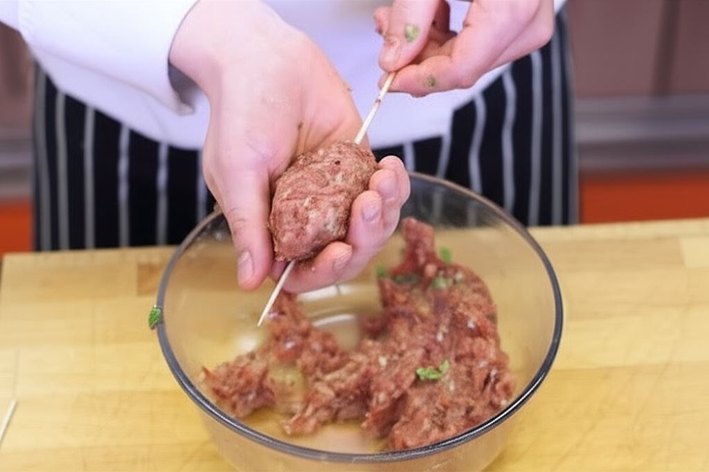 Połącz mięso mielone z cebulką i kształtuj kebaby nadziewając mięso na długie patyki do szaszłyków.