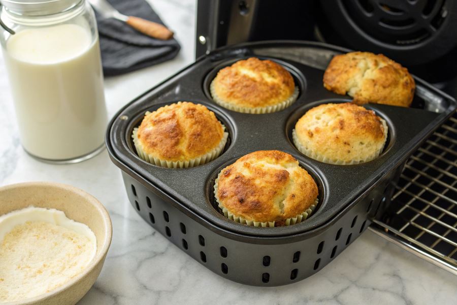 Wskazówka eksperta: Aby uzyskać idealnie wilgotne babeczki, umieść na dnie airfryera małą miseczkę żaroodporną z 2 łyżkami wody. Stworzy to delikatną parę, która zapobiegnie przesuszeniu ciasta.