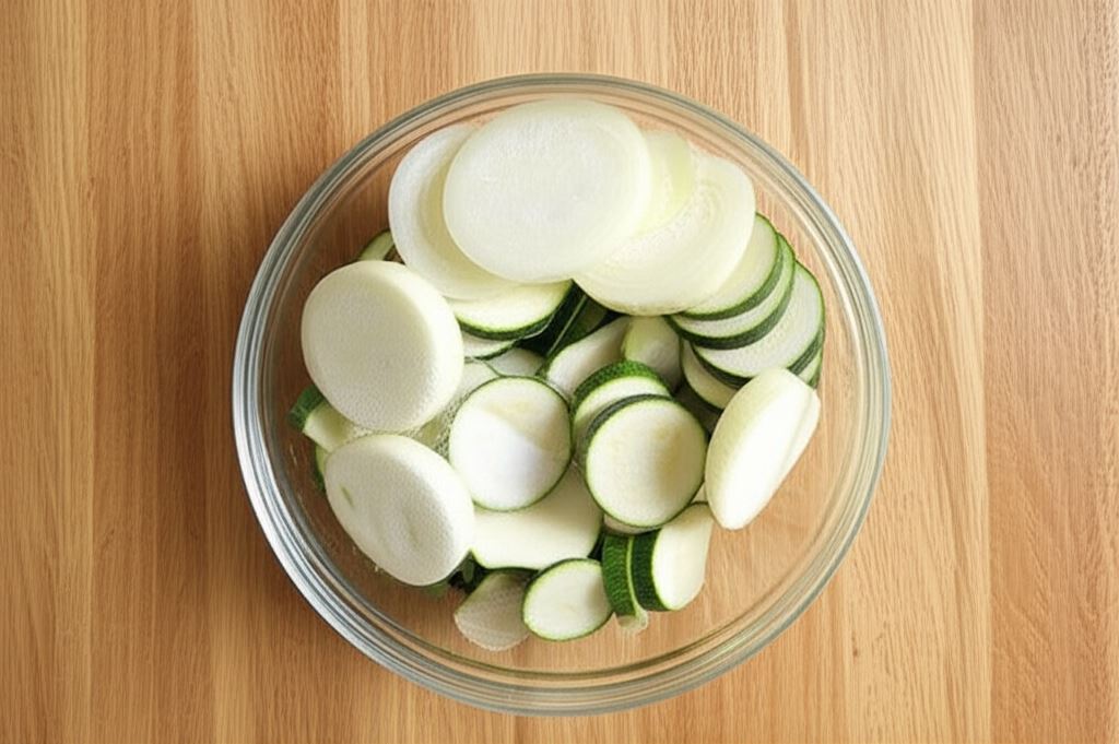 Warzywa opłucz i potnij w plastry. Cebulę oraz cukinię przełóż do miski, posyp solą i odstaw na 1h.