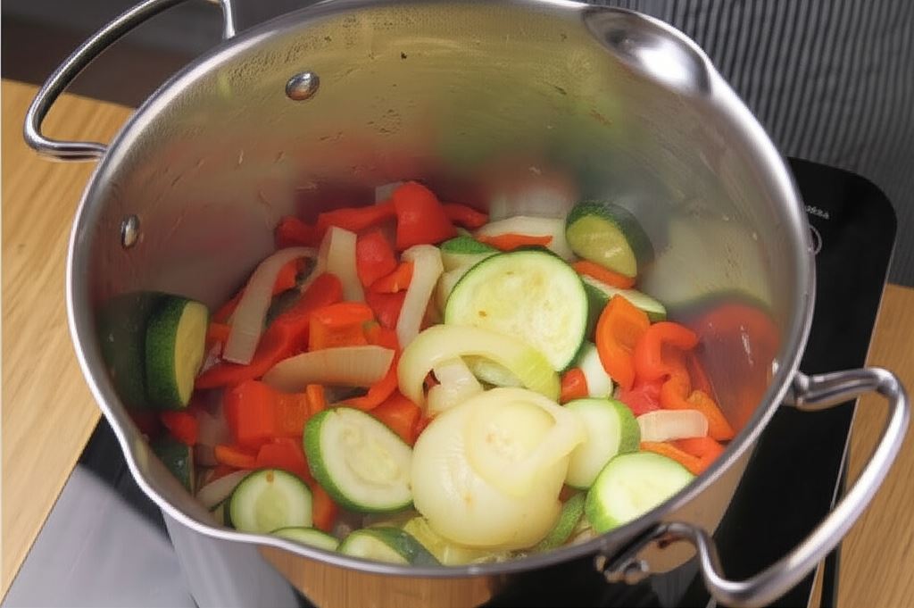Warzywa przenieś do garnka i obsmaż na rozgrzanym oleju, na małym ogniu ok. 30 min. Odstaw do ostygnięcia.
