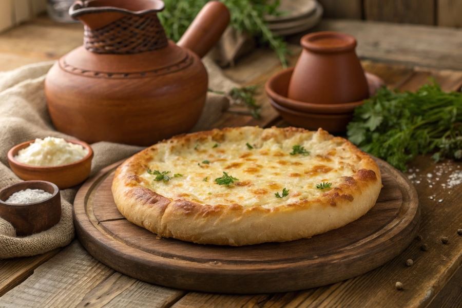 - Jogurt matsoni – tradycyjny gruziński jogurt o delikatnie kwaśnym smaku, doskonale równoważący tłustość sera