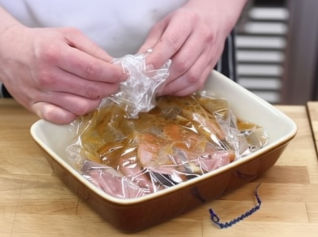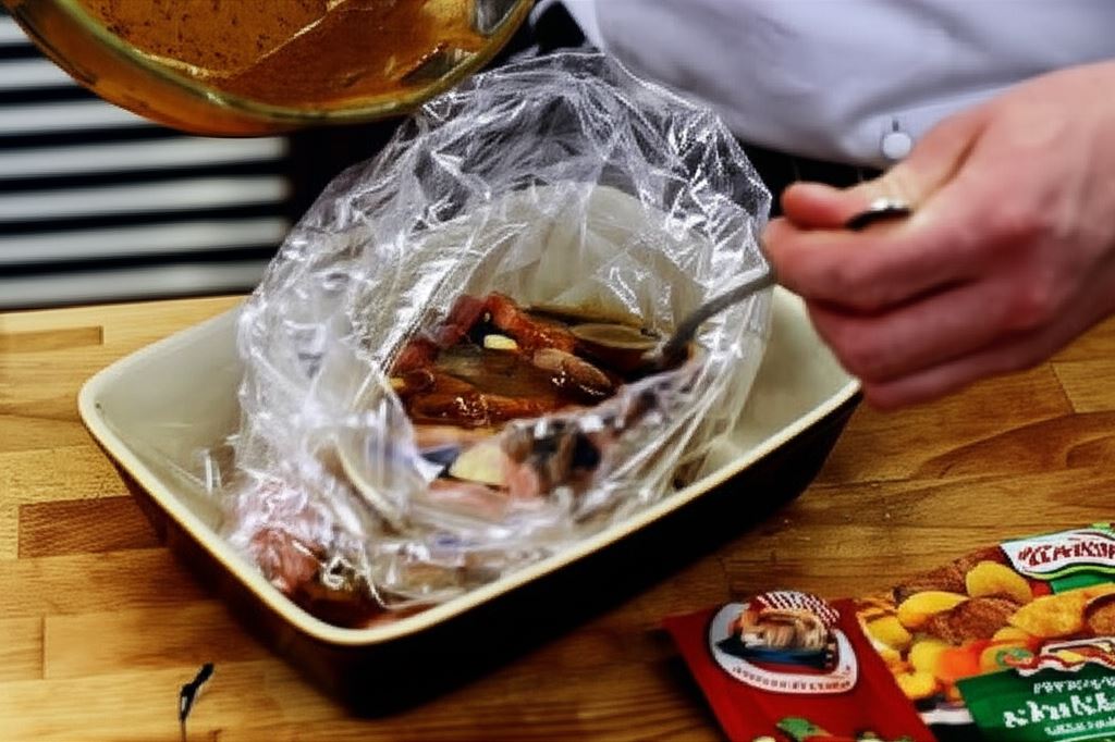 Umieść przygotowane kieszonki w woreczku załączonym do przyprawy Knorr, potem przenieś do naczynia żaroodpornego, polej mięso Przyprawą do karkówki Knorr. Zamknij szczelnie woreczek.