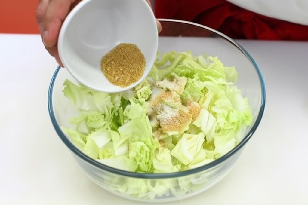 Kapustę pekińską oczyść z wierzchnich liści, opłucz i osusz. Potem poszatkuj, wsyp do miski dodając sól z cukrem. Dłońmi wymieszaj wszystkie składniki tak, aby przyprawy rozłożyć równomiernie na kapuście.
