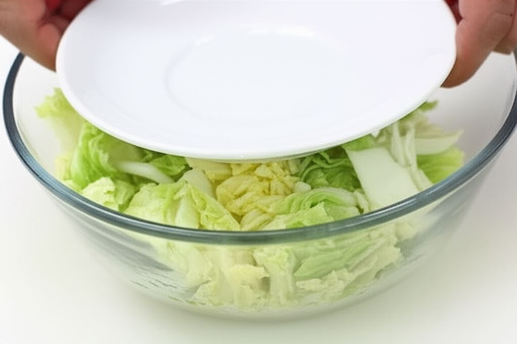 Wymieszaną z przyprawami kapustę nakryj i obciąż czymś ciężkim. Miskę odstaw w ciepłe miejsce na 3 godziny. Po upływie tego czasu ostrożnie opłucz jej zawartość wodą i umieść ponownie w naczyniu.
