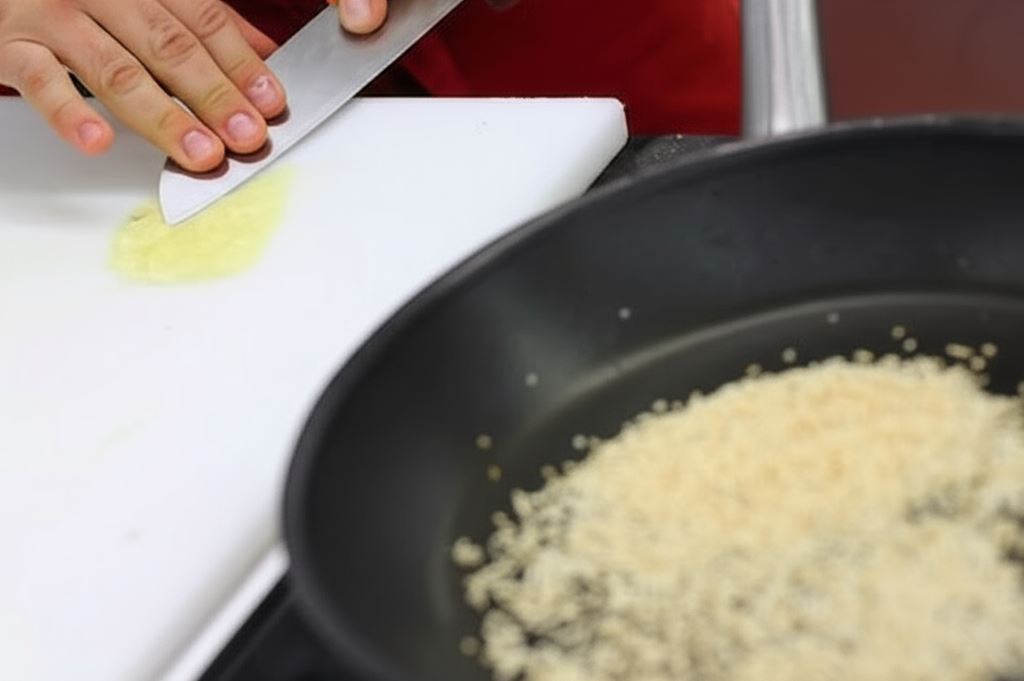Na suchej, lecz dobrze nagrzanej patelni praż nasiona sezamu. Ząbki czosnku pozbaw łupinek i utrzyj na pastę.
