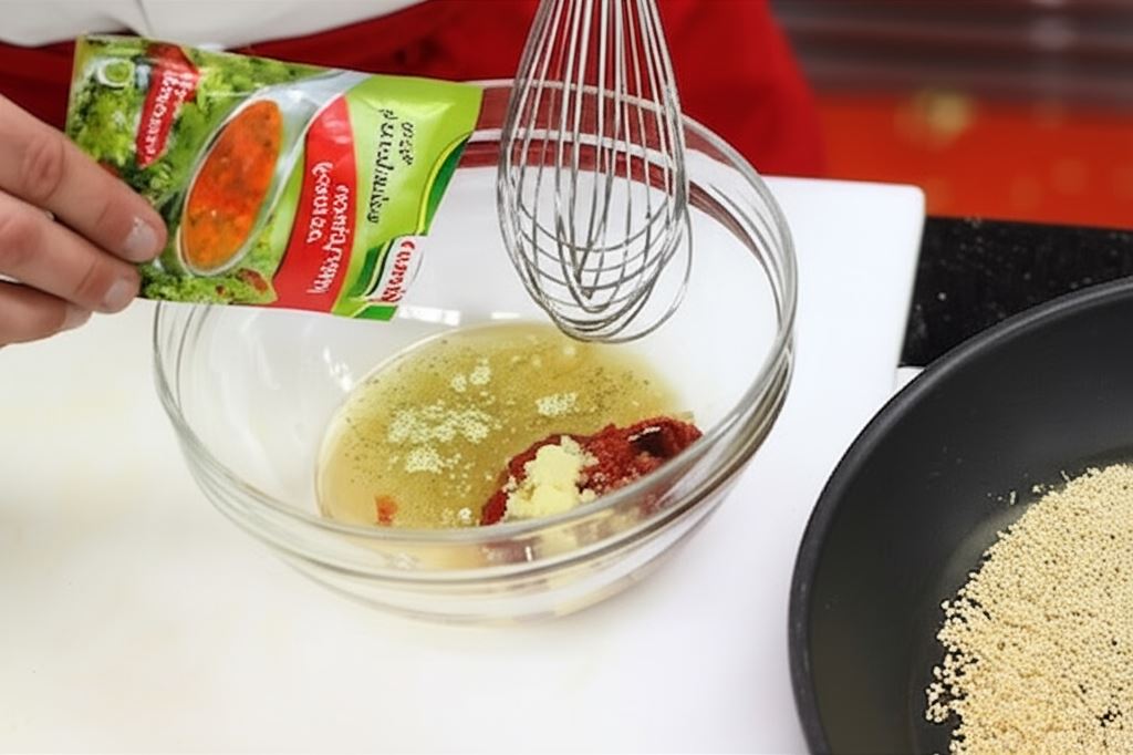 Do rondelka wsyp sos sałatkowy Knorr, wlej sok z limonki, dodaj pastę paprykową, roztarty czosnek, olej i olej sezamowy. Wszystkie składniki dokładnie wymieszaj, po czym odstaw na parę minut, aby sos się przegryzł.