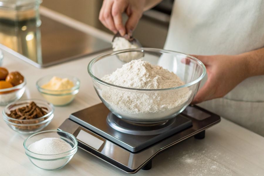 - Produkty sypkie (mąka, cukier) – użyj funkcji tary, najpierw ważąc pojemnik, a następnie zerując wagę przed dodaniem składnika