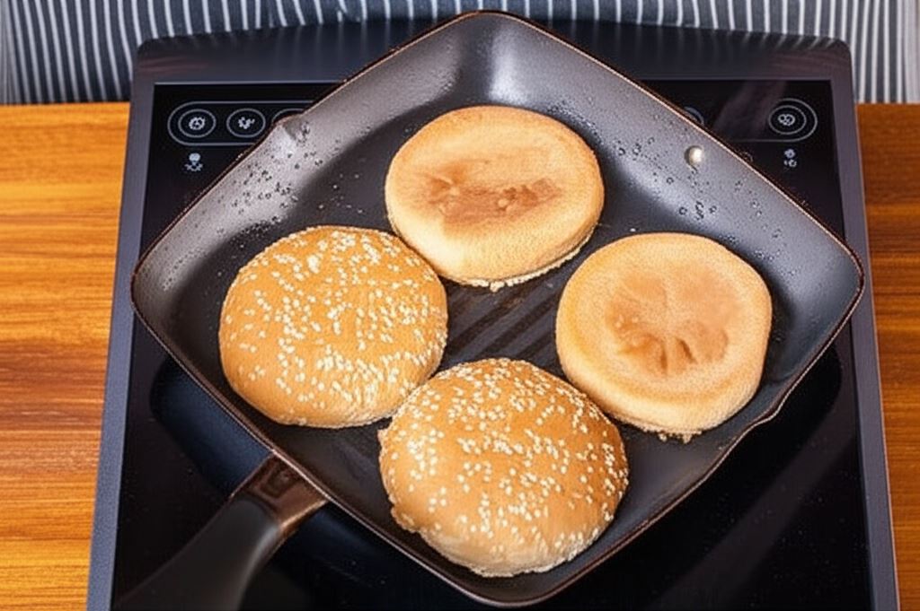 Upiec bekon oraz bułki wcześniej przecięte na połówki.