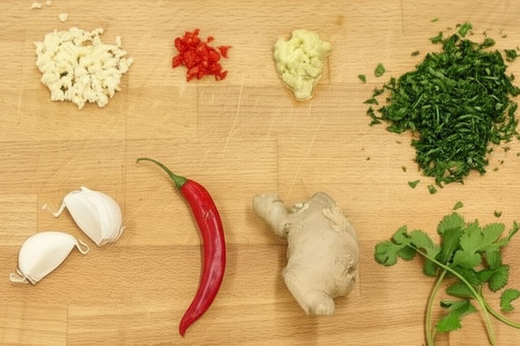 Posiekaj czosnkowe ząbki i kolendrę, chilli pokrój na drobne kosteczki, imbir obierz i zetrzyj na tarce. Przygotowane w ten sposób składniki rozdziel na dwie części. Pierwszą część wsyp do miski.