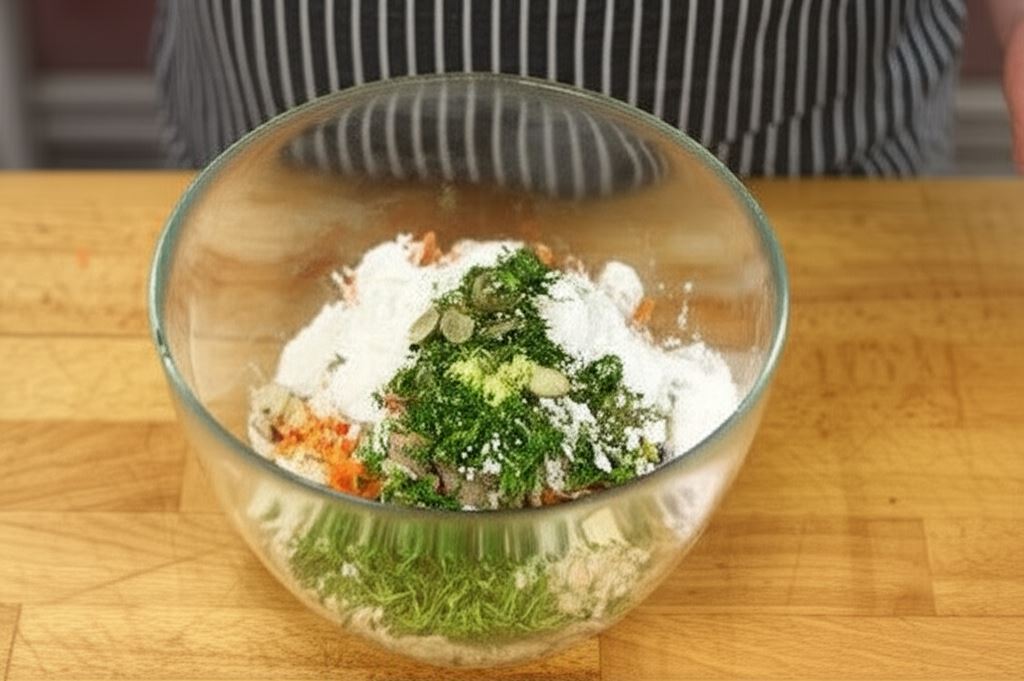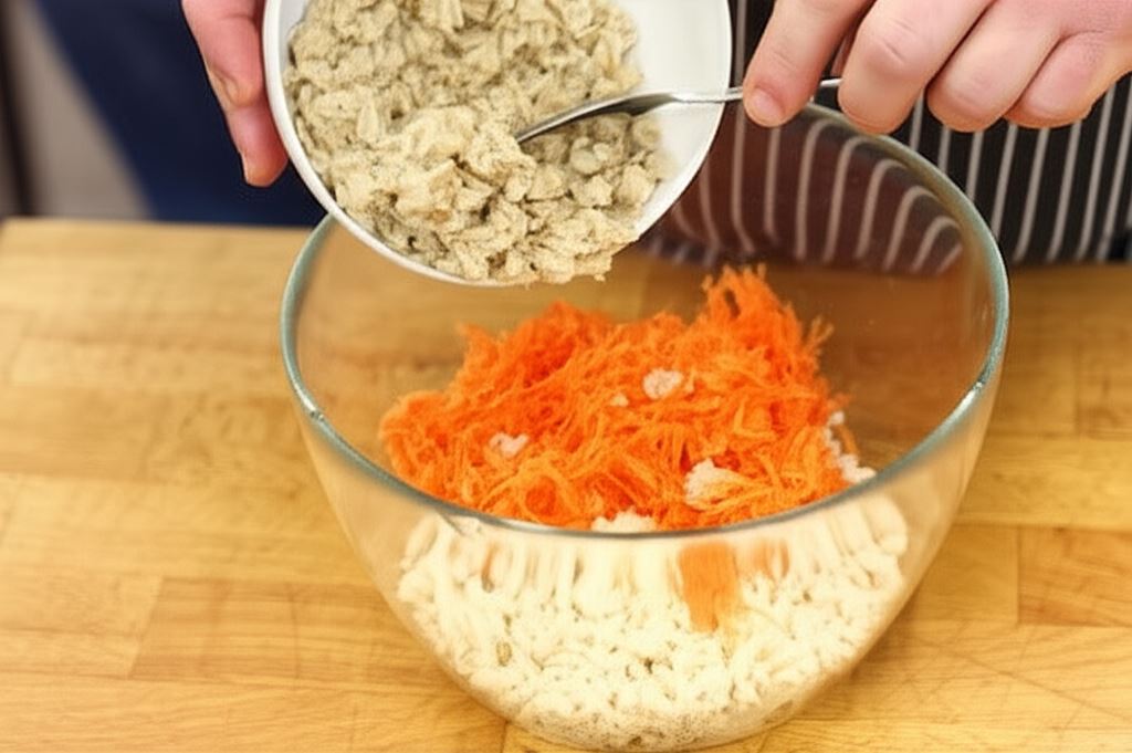 Zmiel ziemniaki i tofu w maszynce do mielenia, marchewkę zetrzyj na tarce, następnie połącz z płatkami.