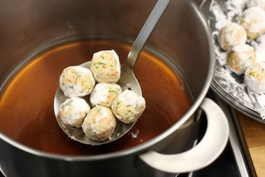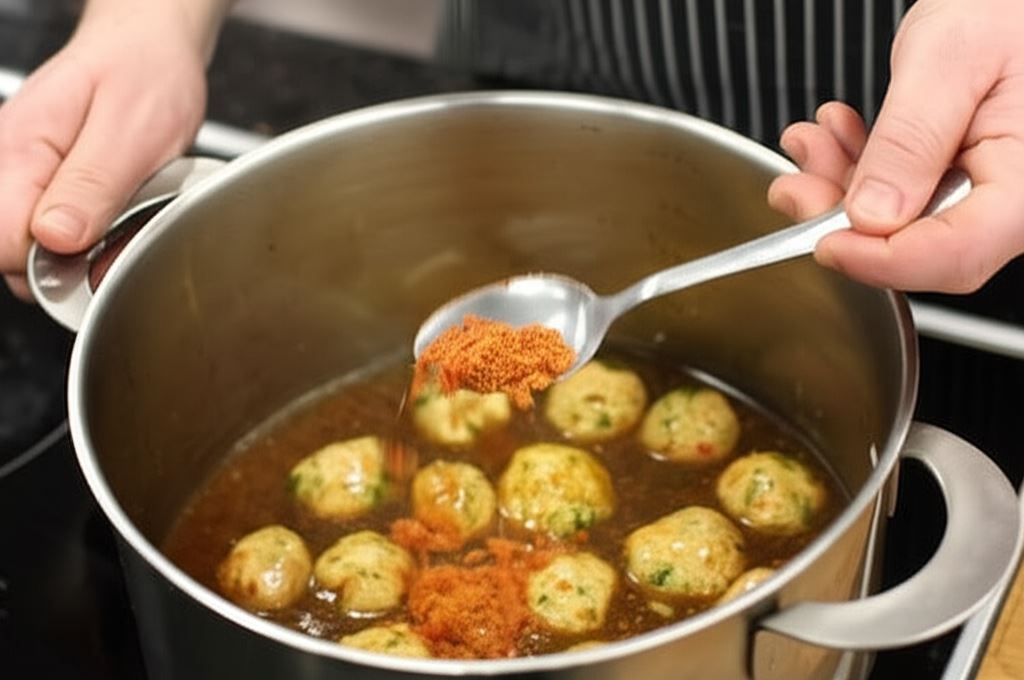W naczyniu o szerokim dnie doprowadź do wrzenia 2 szklanki wody wraz z sosem sojowym i olejem sezamowym. Do wrzącej wody stopniowo wkładaj pulpety, dbając, by się nie rozpadły.