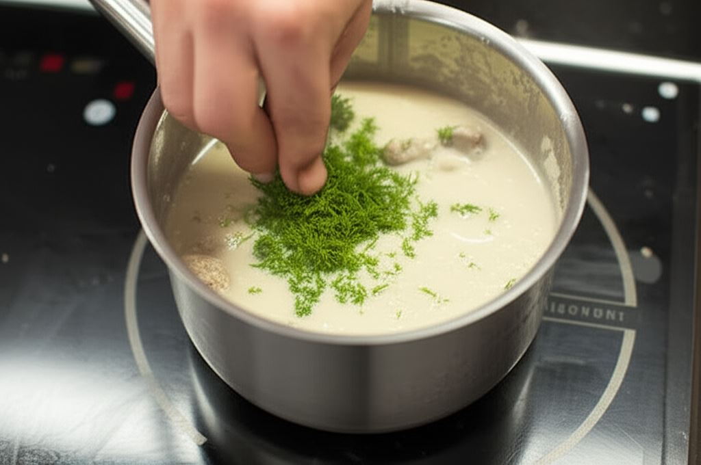 W szklance połącz mąkę, śmietanę i mleko tak, by nie powstały grudki. Stopniowo wlewaj mieszankę ze szklanki do garnka, nieustannie mieszając, a po chwili wsyp koperek. Całość zagotuj jeszcze raz. Serwuj z ryżem.