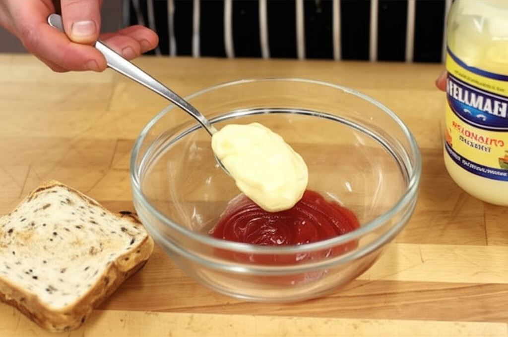Kawałki pieczywa podpiecz moment w tosterze. Majonez połącz z ketchupem i posmaruj tą mieszanką tosty po jednej stronie.