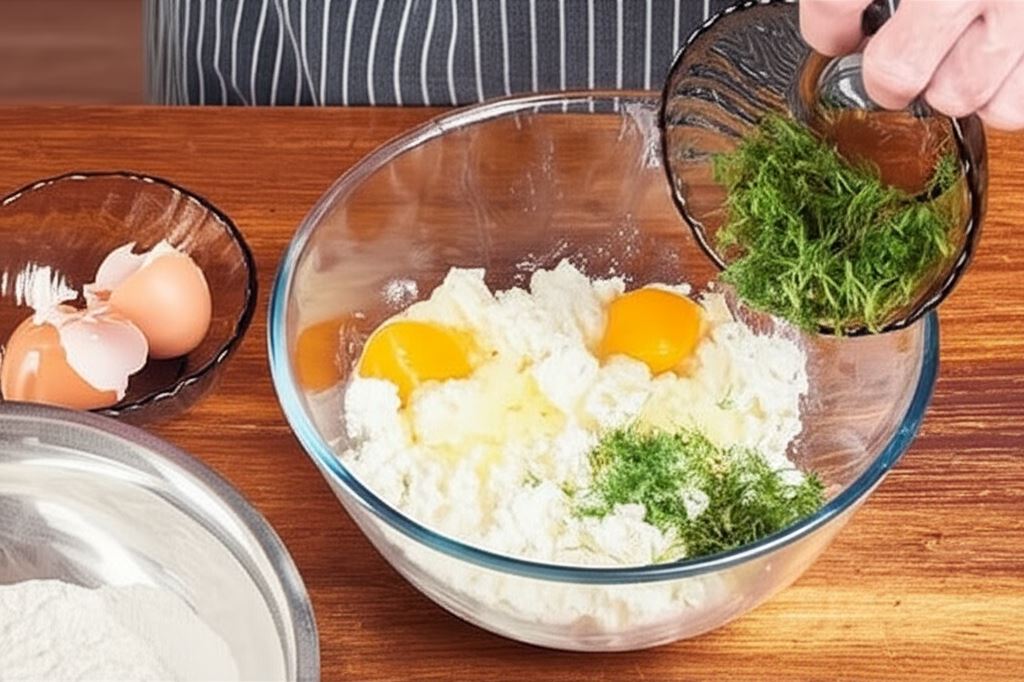 Wymieszaj zmielony twaróg z jajkami, rozdrobnioną fetą i posiekanym koperkiem.