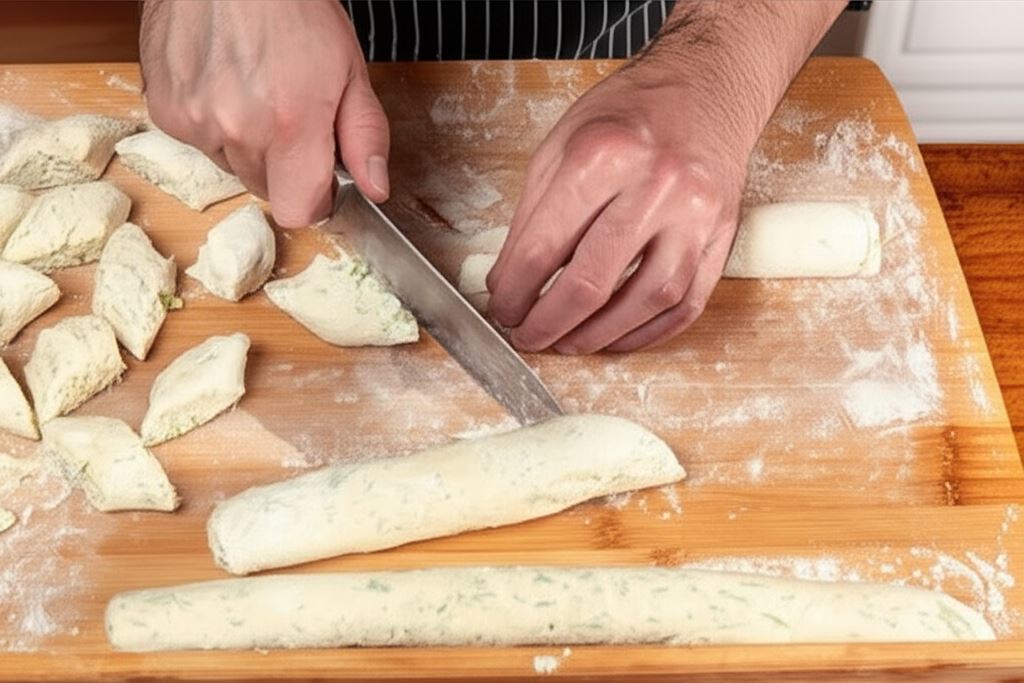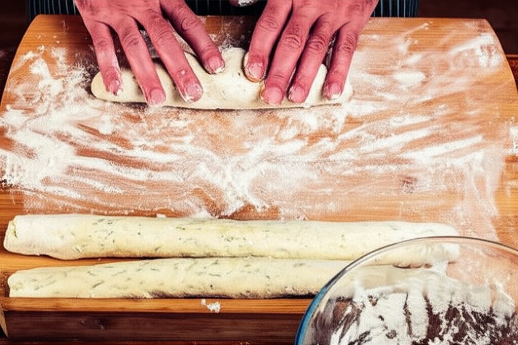Wsyp mąkę, dopraw solą i pieprzem. Wyrób i uformuj wałeczki.