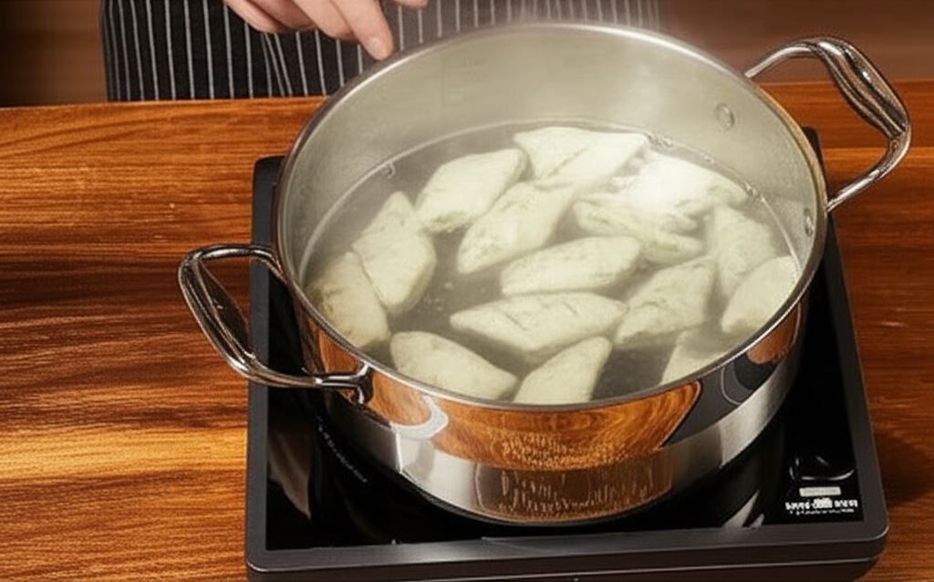 Gotuj porcjami w sporej ilości posolonej wrzącej wody przez 5 minut od momentu wypłynięcia.