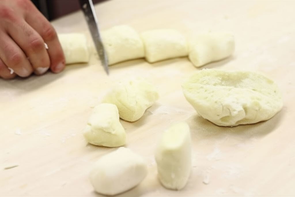 Potem oprósz lekko mąką, rozdziel ciasto na mniejsze części i z każdej uformuj wałeczek. Podziel na mniejsze kawałki.