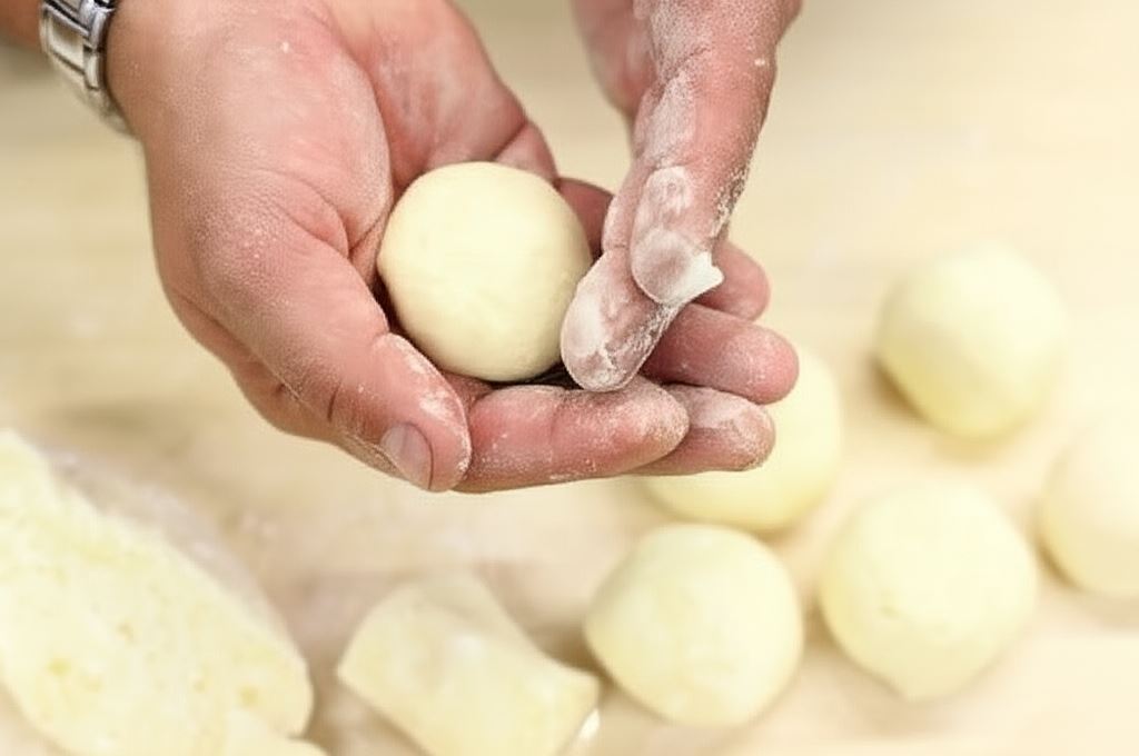 Każdy kształtuj w rękach tak, aby uformować ładne i okrągłe knedle. W razie konieczności obsyp stolnicę i dłonie mąką.