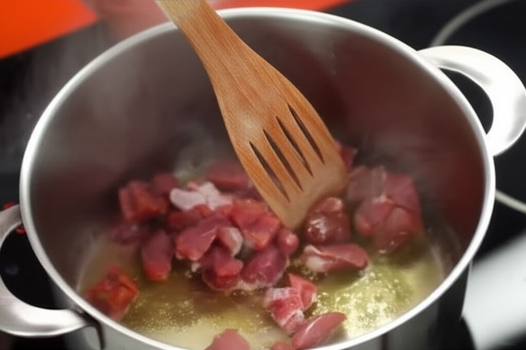 Przypraw mięso Przyprawą Uniwersalną Delikat Knorr, obsmaż je, po czym zalej litrem gorącej wody i gotuj na wolnym ogniu (aż do momentu, kiedy będzie miękkie).
