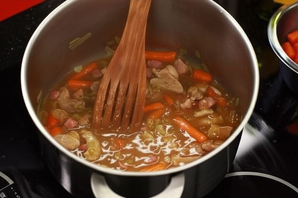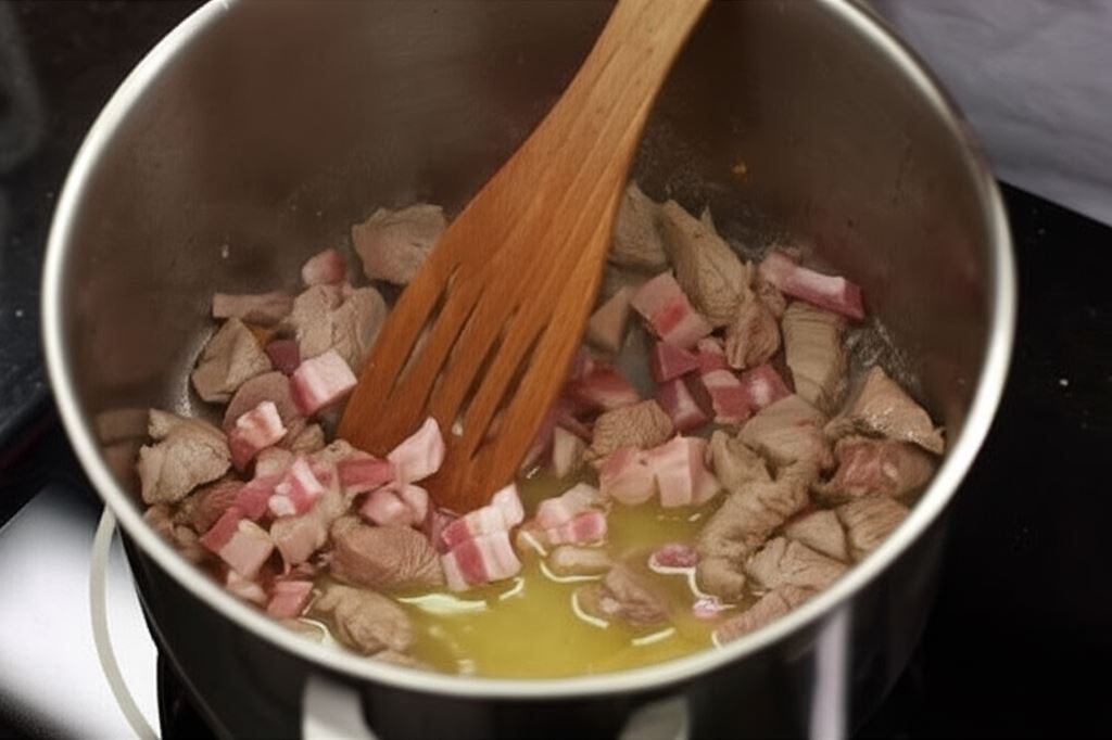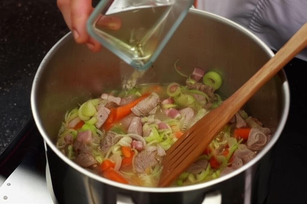 W trakcie duszenia dorzuć boczek, a pod sam koniec dodaj marchewki i pora.