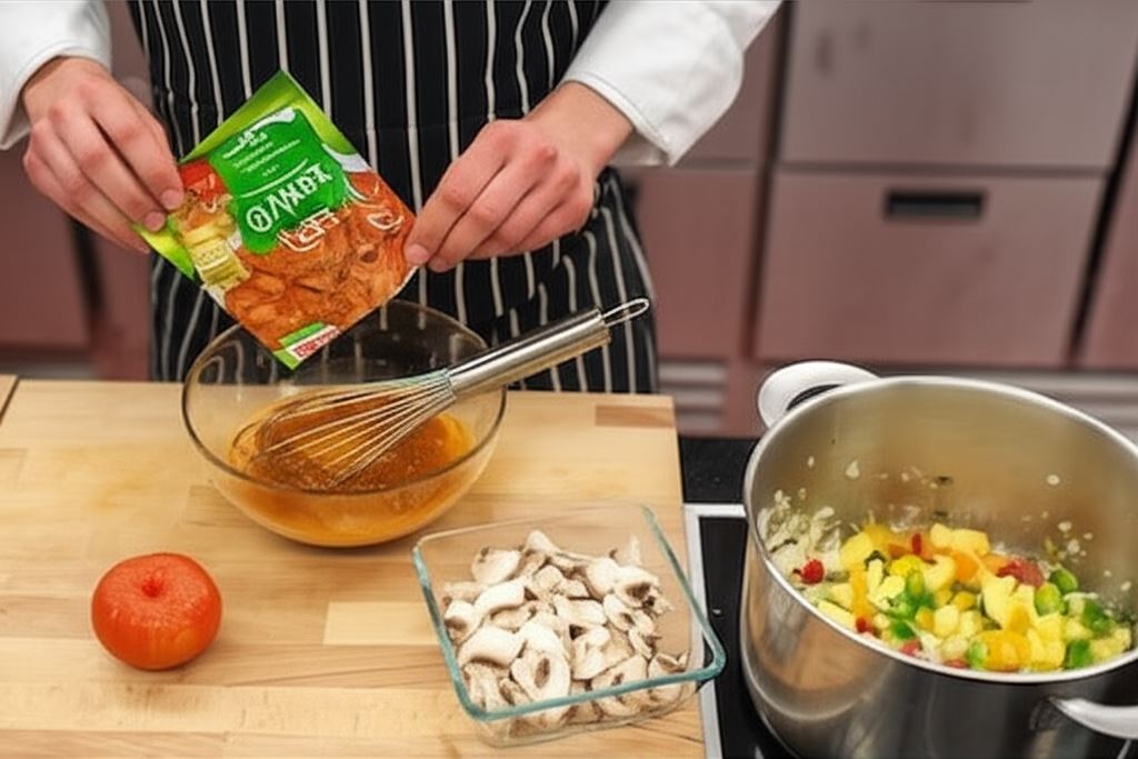 Knorr Naturalnie Smaczne - Gulasz wymieszaj z 350 mililitrami wody i wsyp razem z pieczarkami do garnka.