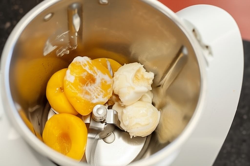 W naczyniu blendera zmiksuj lody z brzoskwinią i mlekiem.