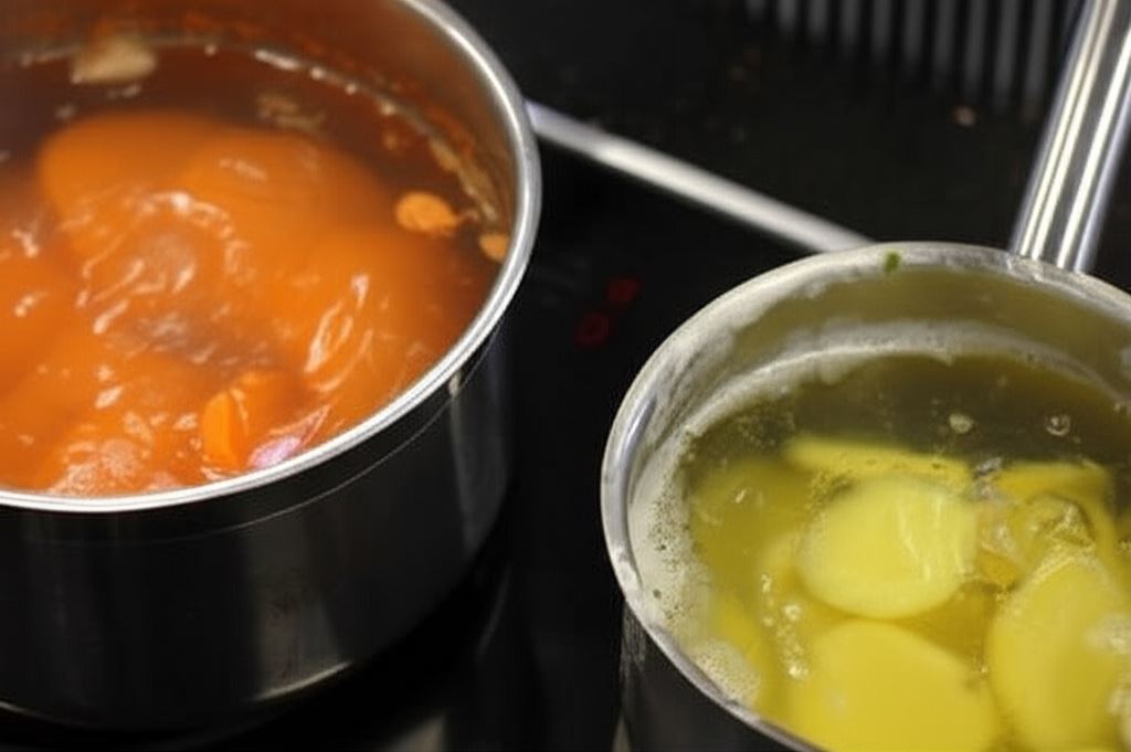 Obierz ziemniaki i bataty, następnie pokrój je w grube plastry o grubości 0,5 cm. Każde warzywo ugotuj oddzielnie w delikatnie osolonej wodzie, aż będą miękkie.