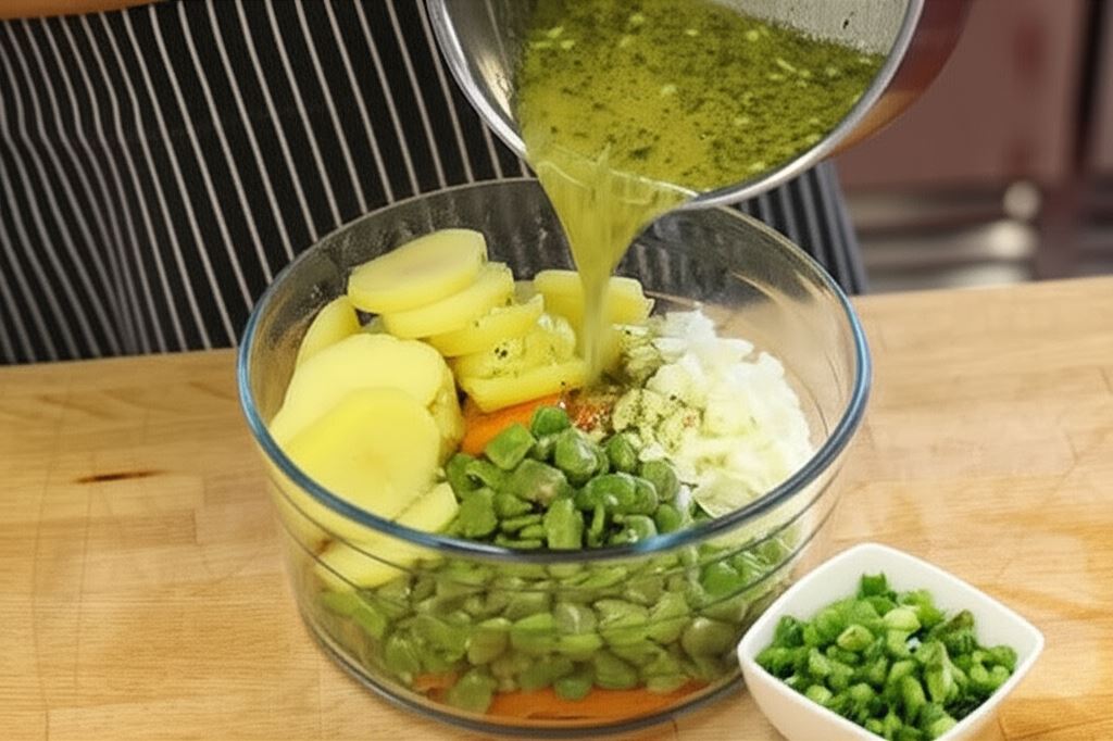 Szukasz dania, które zachwyci nie tylko smakiem, ale i wyglądem? Nasza kolorowa sałatka ziemniaczana z bobem i batatami to prawdziwa uczta dla zmysłów! Soczyste ziemniaki, słodkie bataty i delikatny bób tworzą harmonijną kompozycję smaków, podkreśloną aromatycznym sosem na bazie kostki rosołowej Knorr i oliwy truflowej.