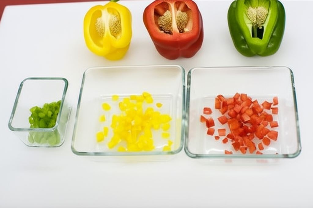 Papryki oczyść z nasion oraz białych fragmentów. Potem pokrój je w małą kostkę o wymiarze 0,5 centymetra.