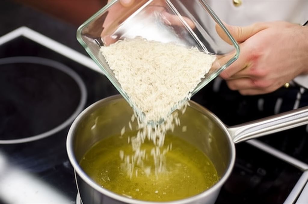 Dodaj ryż i gotuj do miękkości, około 15 minut. Następnie odcedź ryż i umieść go w misce.