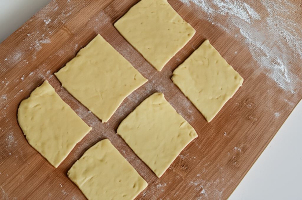 Ciasto wyjmujemy z lodówki. Dzielimy je na trzy części. Ciasto rozwałkowujemy na grubość około 0,5 cm. Oprószamy je mąką. Tniemy na kwadraty o wymiarach około 9 cm x 9 cm.
