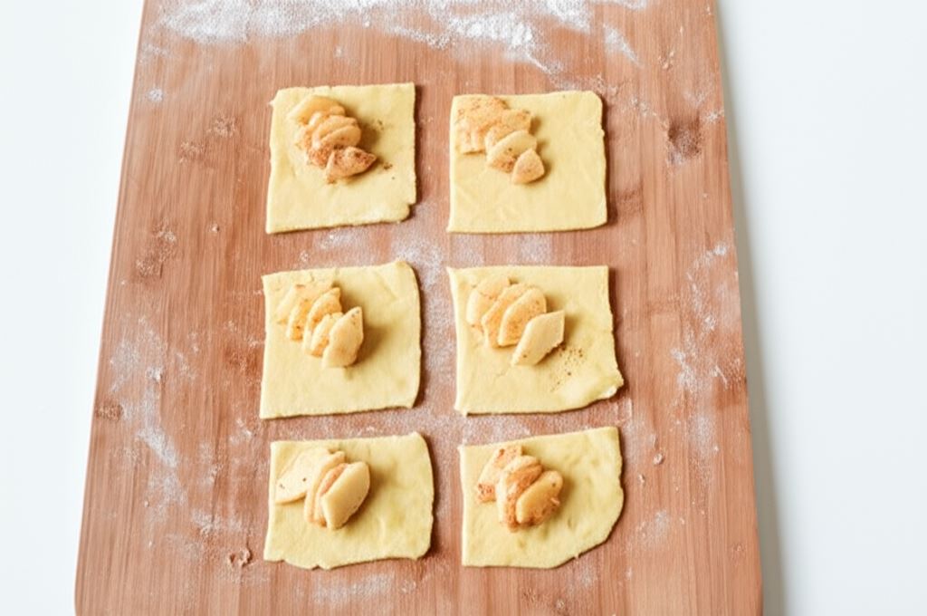 Układamy około 6 plasterków jabłek na każdy kwadrat.