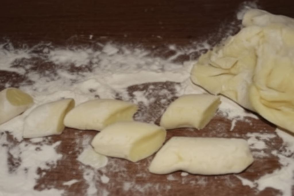 Stolnicę albo blat oprószyć mąką - wyłożyć ciasto na kopytka. Podzielić na części. Uformować wałki i pokroić na kluski (rozmiar według preferencji).
