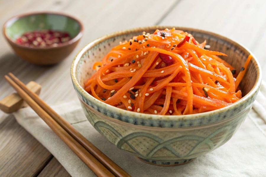 Koreańska sałatka z marchewki, znana jako muchim lub namul, wywodzi się z tradycyjnej kuchni koreańskiej sięgającej dynastii Joseon (1392-1910). Początkowo przygotowywana była jako część banchan – zestawu małych przystawek serwowanych do głównego posiłku. Oryginalna wersja, zwana danggeun-namul, składała się z blanszowanej marchewki doprawionej olejem sezamowym, czosnkiem i solą. Współczesna wersja z ostrymi przyprawami zyskała popularność w latach 60. XX wieku, gdy handel między Koreą a innymi krajami azjatyckimi zintensyfikował wymianę kulinarną.