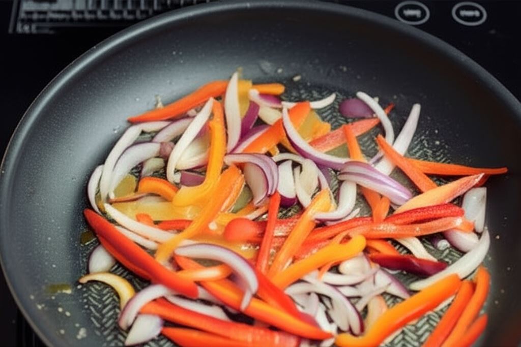 Wlej odrobinę oleju na patelnię. Kiedy tłuszcz porządnie się nagrzeje, dodaj cebulę z papryką i podsmażaj, aż piórka cebuli staną się szkliste. Potem wlej jajka z przyprawami i smaż na małym ogniu bez mieszania, dopóki masa nie zacznie się ścinać.