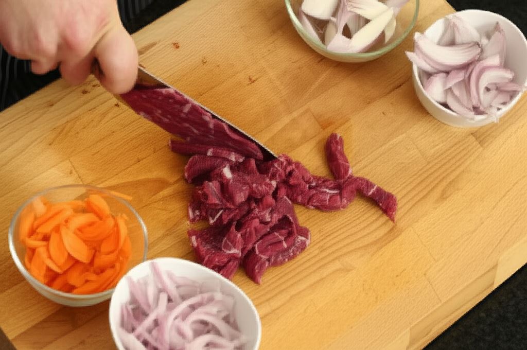 Mięso potnij na bardzo cienkie plastry, marchewkę obierz, przekrój na połowę, a potem pokrój w cienkie paski używając obieraczki. Szalotkę potnij na kawałki o długości 5 cm, a następnie przetnij wzdłuż na pół.
