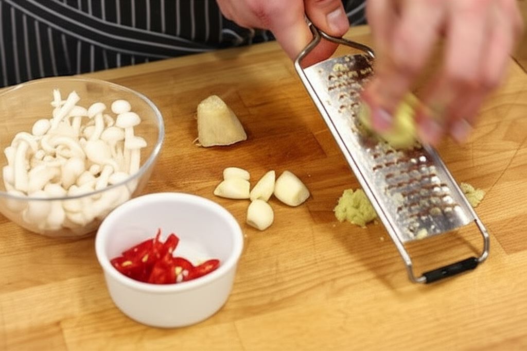 Zetrzyj czosnek i imbir na tarce. Chili pokrój na cienkie plastry nie usuwając pestek. Grzyby opłucz w zimnej wodzie, odetnij od korzenia tak by każdy grzyb był osobno.
