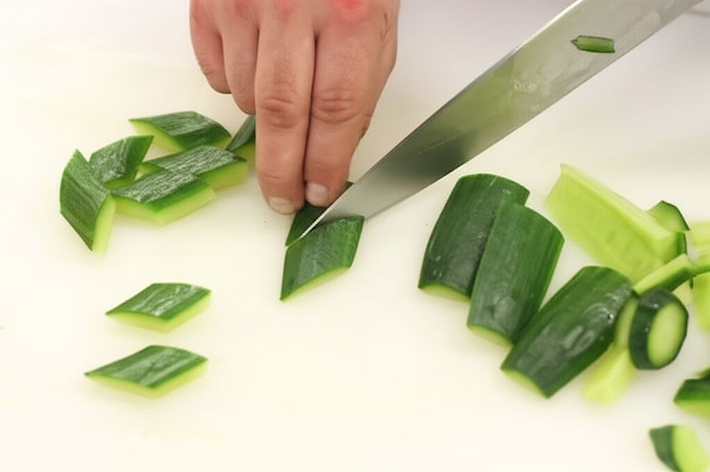 Odetnij końcówki od ogórka. Potem przekrój go wzdłuż na połowę, a następnie jeszcze raz na pół, by uzyskać cztery ćwiartki. Z każdej części wzdłuż odetnij pestki. Pozostałą płaską część ogórka pokrój delikatnie pod kątem co 2 centymetry tak, aby utworzyły się romby.