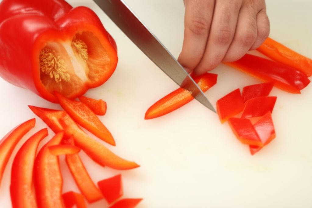 Papryki oczyść z nasion i gniazd, potem pokrój w paski o szerokości 1 centymetra, a następnie w romby, podobnie jak ogórka.